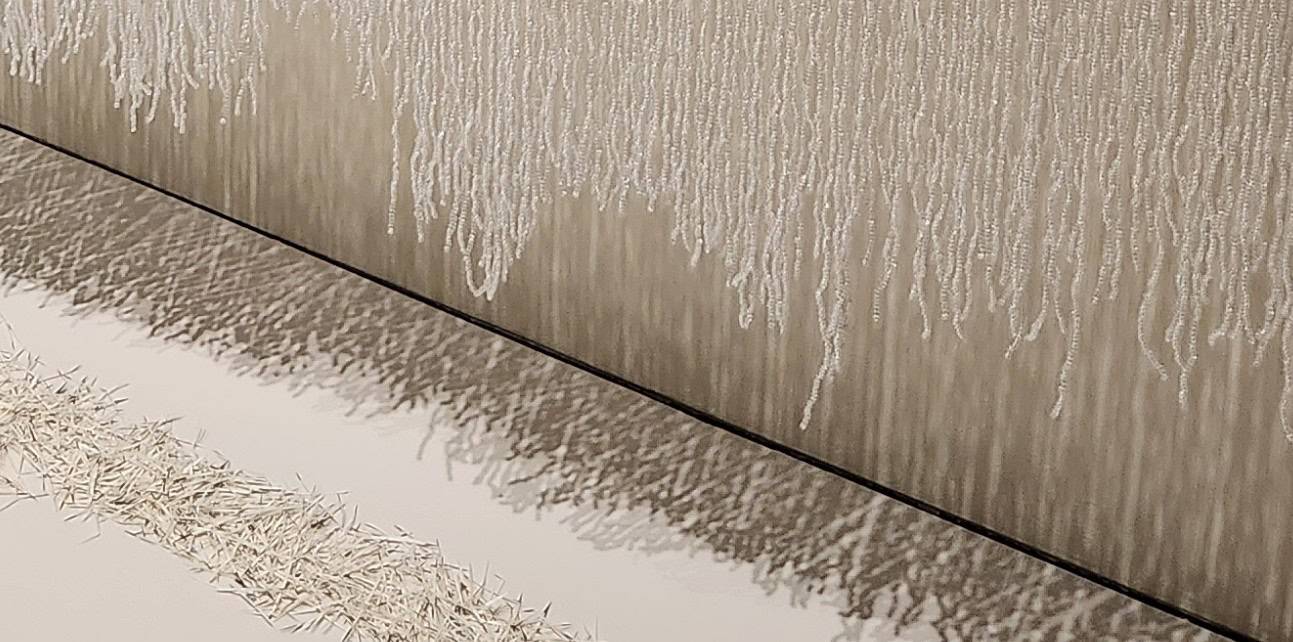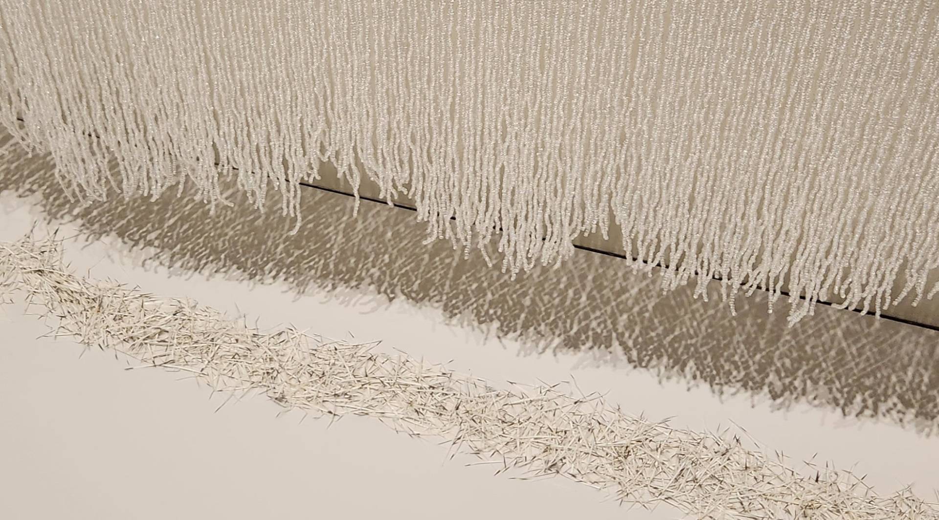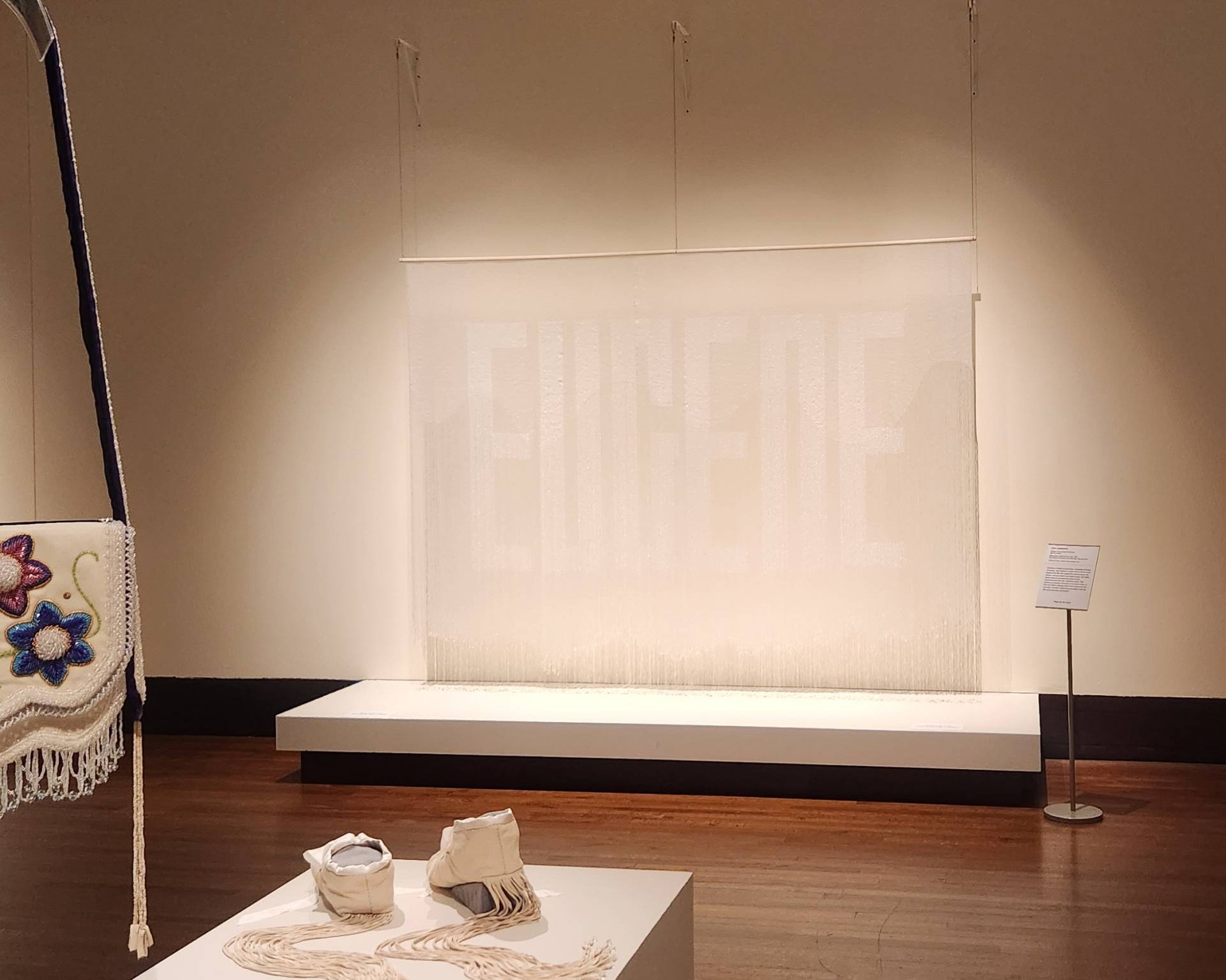 Everytime I think of you I cry (2021) is another work by Anderson in the show that commemorates an important relationship in her life. This piece is an enormous, beaded curtain made from varying shades of white translucent and transparent beads that hangs off a long wooden dowel. Piles of porcupine quills are pooled below the beaded tendrils along the ground like a little trail of animal detritus. From afar, this viewer can see that the piece spells out the name “Eugene” but as I get closer the lettering becomes more difficult to see and I begin to see instead gentle gradations in the translucency of the beads, which resemble long arcing waves. There is also one tiny red spirit bead in the piece that I could not find. Created by Anderson’s entire family to “commemorate their loss” (Eiteljorg), Everytime I think of you I cry honours Anderson’s brother who was taken in the Sixties Scoop by re-imagining the kitschy 1960s beaded curtain as a memorial object. Anderson simulates the weight of grief by using beads to evoke the transparency of tears. The beautiful swoops that link each individual strand seem to simulate the waves of grief. Standing there, a bit overcome, I feel a strange desire to walk through the curtain. What will be on the other side for me? Why do I feel such a strong wish to touch this piece? Each bead a moment of pain felt and released, strung up like a glorious and heartbreaking representation of many hearts being hurt and healed, Anderson has created a visceral image of the weight that relationships take in our lives.