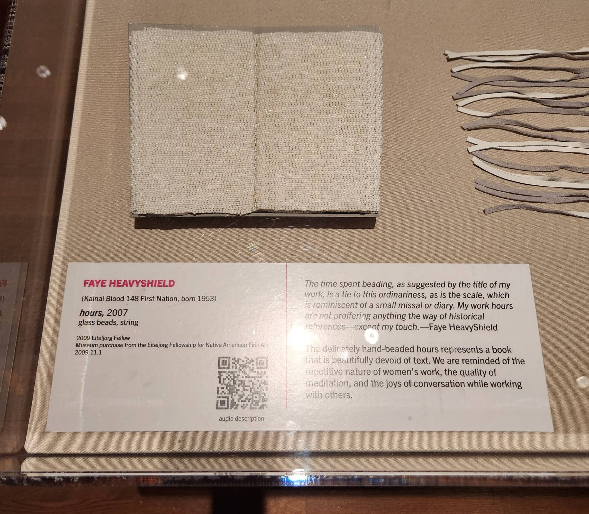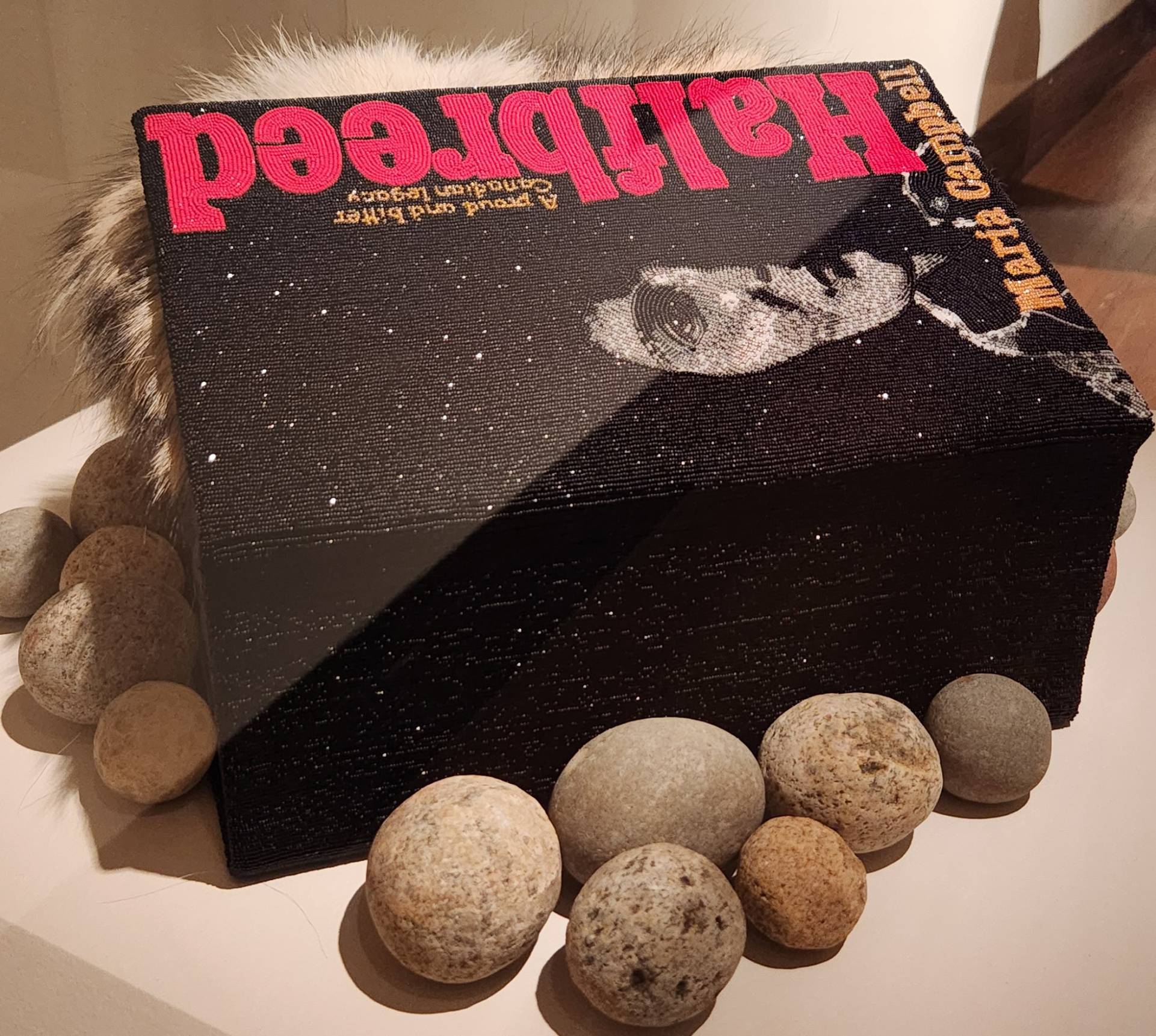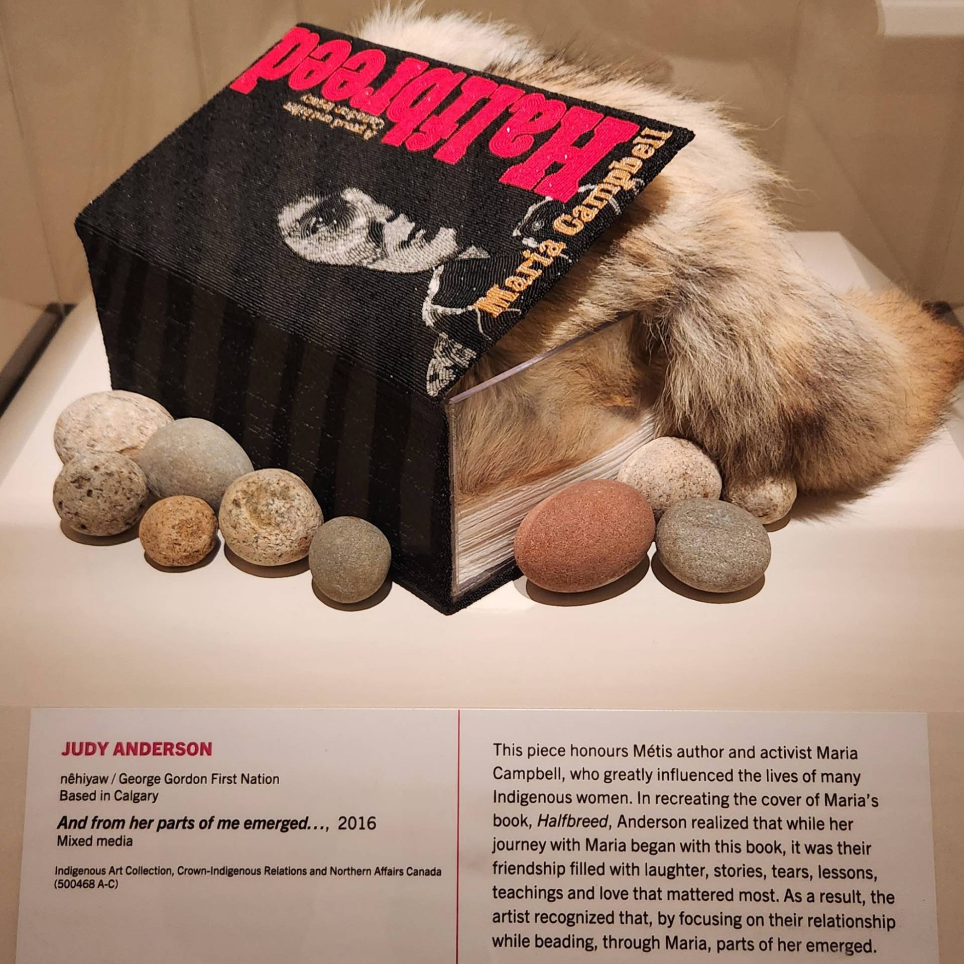 Other pieces in the show also spoke to the durational nature of beadwork and the sacred time of its practice. Faye Heavyshield’s beaded book hours (2007), for instance, is open onto a what looks like a series of blank white pages. It seems to ask, is beadwork a kind of inarticulate writing? Transparent as the page, it can be read but not without being translated. Heavyshield’s work sits next to Skawennati’s wampum piece Intergalactic Empowerment Belt (Onkwehón:we, Na’vi, Skyworlder, LGM, Overlord) (2017), which I think was an inspired curatorial choice to get viewers thinking about the complex interpretive demands that beadwork asks of us. Wampum belts often have dedicated “keepers” who are responsible for carrying and interpreting the belt. Skawennati’s wampum belt imagines a future treaty with alien civilizations but no “keeper” appears forthcoming. As viewers, are we the ones responsible for these interpretations? Near the back of the exhibit, behind Heavyshield and Skawennati, sits Judy Anderson’s ode to Maria Campbell And from her parts of me emerged… (2016). A full fox skin sits curled in a giant beaded version of the newest edition of Maria Campbell’s memoir Halfbreed (1973) almost like a sleeping cat. In the accompanying panel, Anderson explains that the piece represents the “part of her[self]” that emerged from her friendship with Campbell, which began for Anderson while reading her book. A relationship between two people often has a life of its own and the little sleeping fox spoke to me as a beautiful and joyful representation of Anderson and Campbell’s.