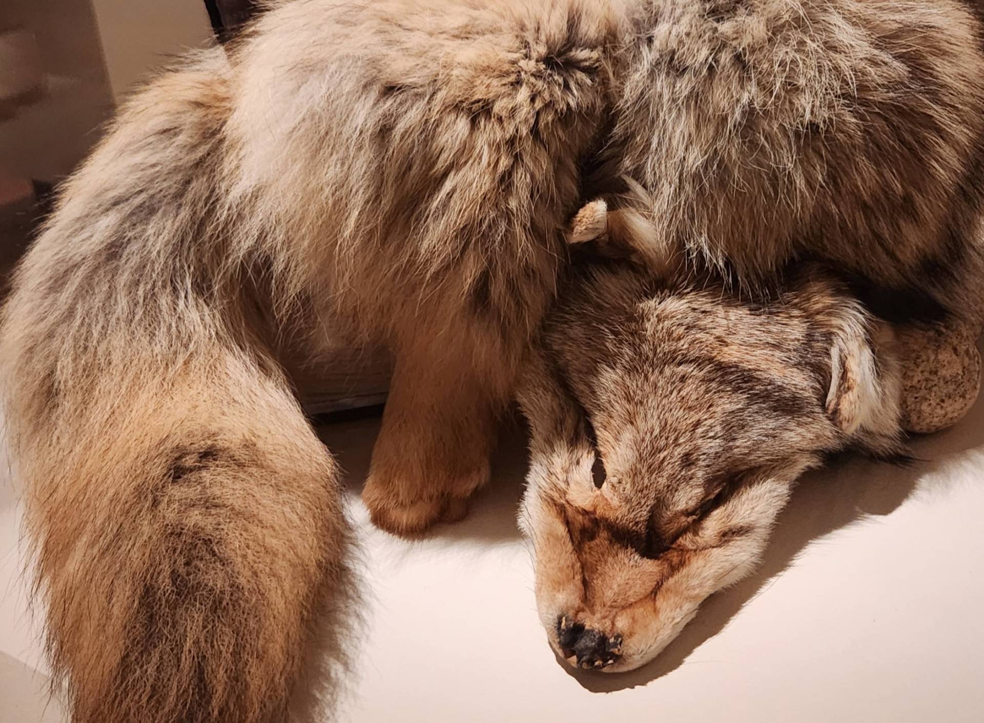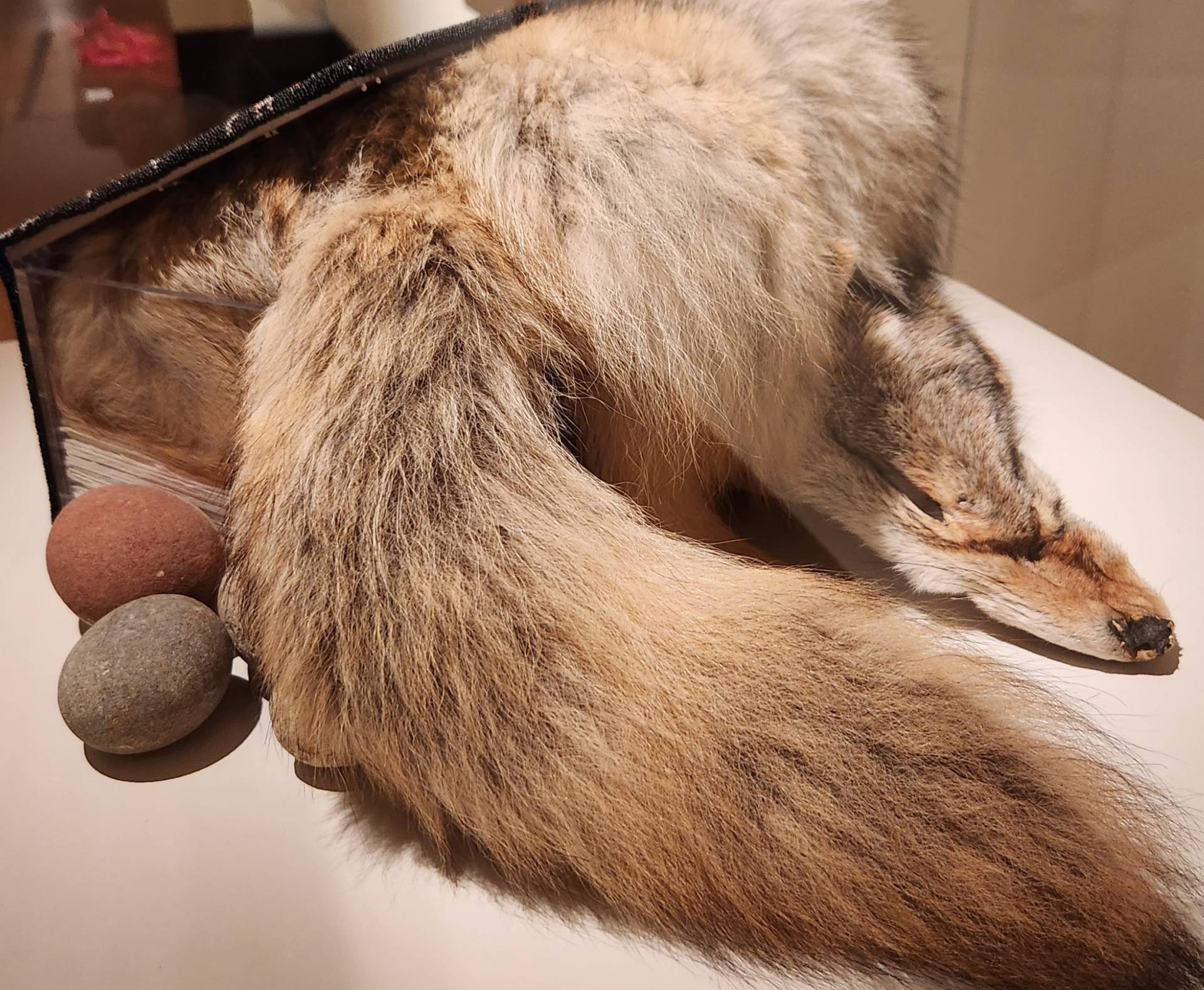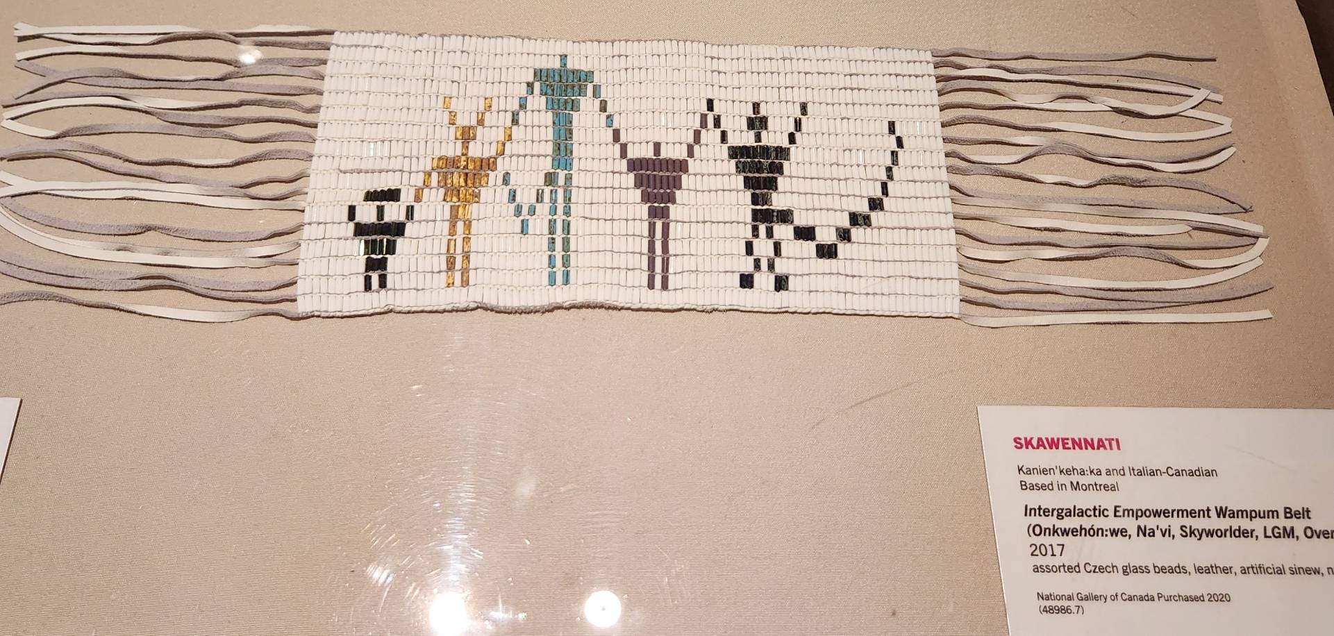 Other pieces in the show also spoke to the durational nature of beadwork and the sacred time of its practice. Faye Heavyshield’s beaded book hours (2007), for instance, is open onto a what looks like a series of blank white pages. It seems to ask, is beadwork a kind of inarticulate writing? Transparent as the page, it can be read but not without being translated. Heavyshield’s work sits next to Skawennati’s wampum piece Intergalactic Empowerment Belt (Onkwehón:we, Na’vi, Skyworlder, LGM, Overlord) (2017), which I think was an inspired curatorial choice to get viewers thinking about the complex interpretive demands that beadwork asks of us. Wampum belts often have dedicated “keepers” who are responsible for carrying and interpreting the belt. Skawennati’s wampum belt imagines a future treaty with alien civilizations but no “keeper” appears forthcoming. As viewers, are we the ones responsible for these interpretations? Near the back of the exhibit, behind Heavyshield and Skawennati, sits Judy Anderson’s ode to Maria Campbell And from her parts of me emerged… (2016). A full fox skin sits curled in a giant beaded version of the newest edition of Maria Campbell’s memoir Halfbreed (1973) almost like a sleeping cat. In the accompanying panel, Anderson explains that the piece represents the “part of her[self]” that emerged from her friendship with Campbell, which began for Anderson while reading her book. A relationship between two people often has a life of its own and the little sleeping fox spoke to me as a beautiful and joyful representation of Anderson and Campbell’s.
