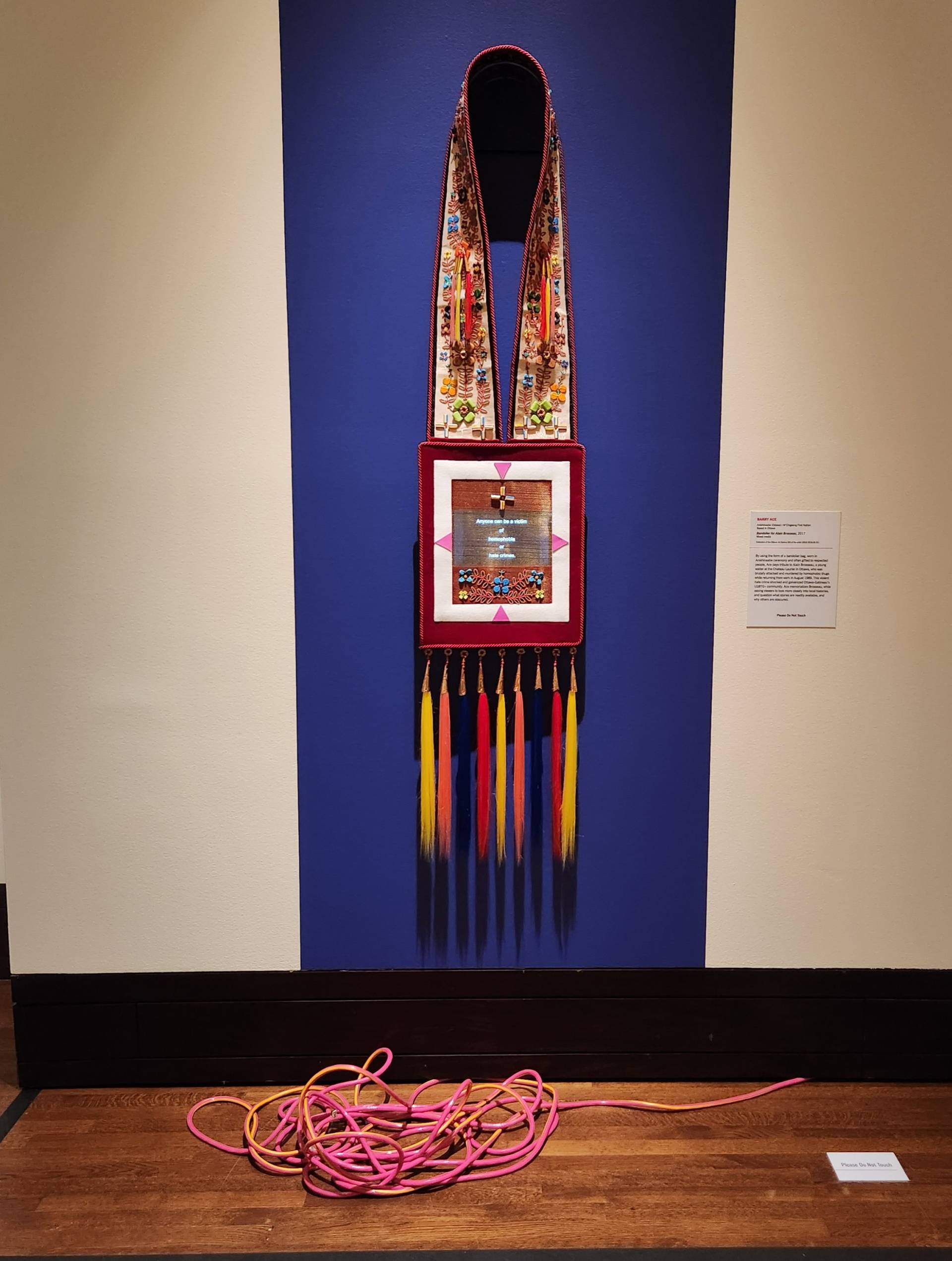 Radical Stitch is a phenomenal show. Correctly nicknamed “the Big-Ass Beading Show” by its curators Sherry Farrell Racette, Michelle LaVallee, and Cathy Mattes, the exhibit is massive, representing fifty-two Indigenous artists from across North America (17). 1 Flipping through the catalogue, it’s obvious not all the works from the original show made it to Indianapolis (probably due to spatial constraints) but it was still impressive, even in its abbreviated form. As an amateur beader, I was overwhelmed by the sheer scale and ambition of the pieces. Even the smallest works in the show must have taken at least a hundred hours to design and produce. Consider, also, the exorbitant costs of production (beads ain’t cheap) and suddenly every step in the exhibit feels as if you are walking amongst giants. In this review, I’ll be talking about the pieces that provoked the most thinking from me rather than attempting to judge the best or most impressive.