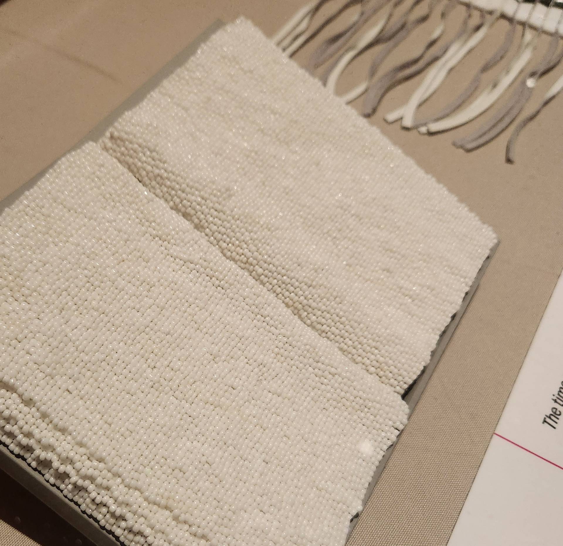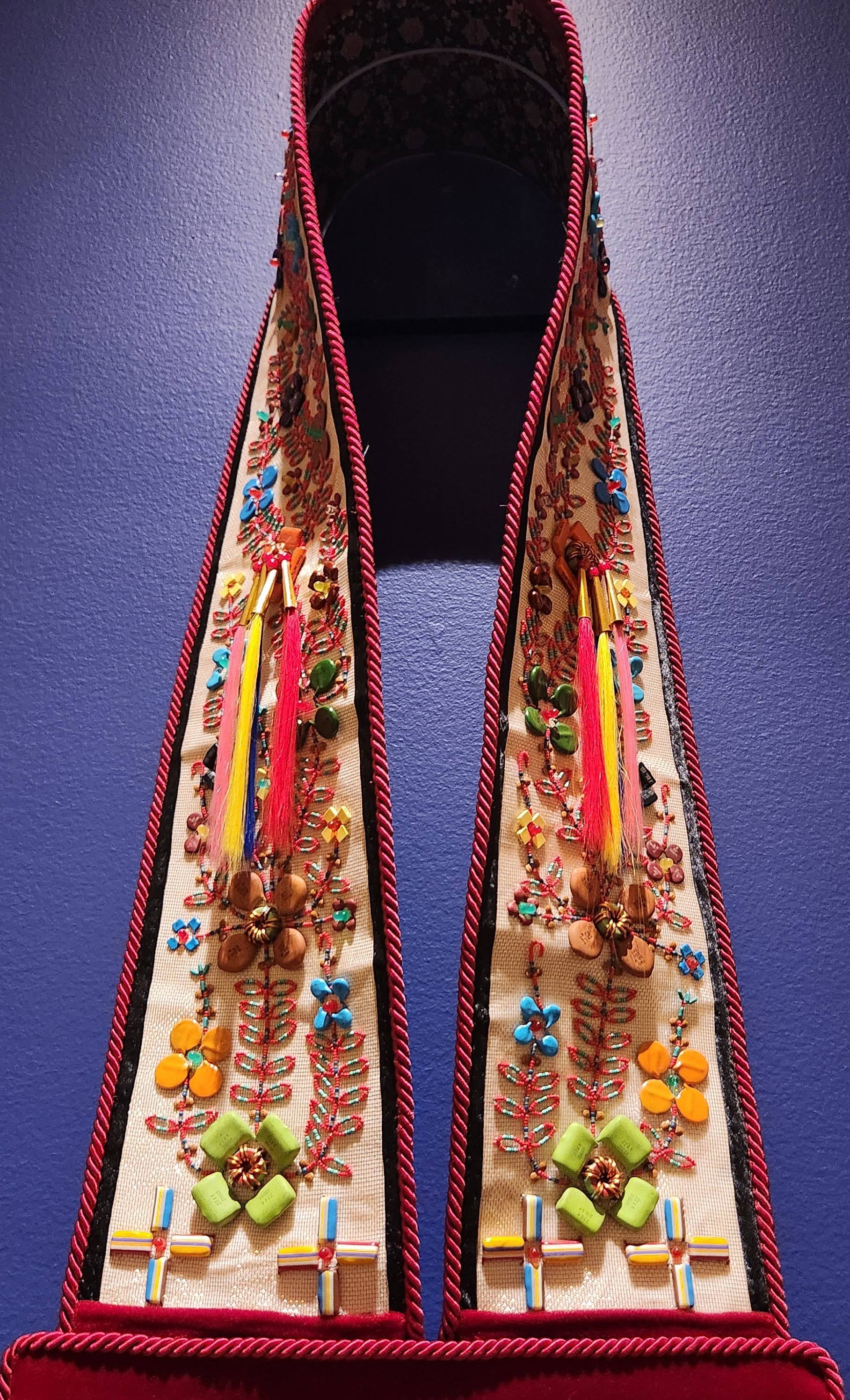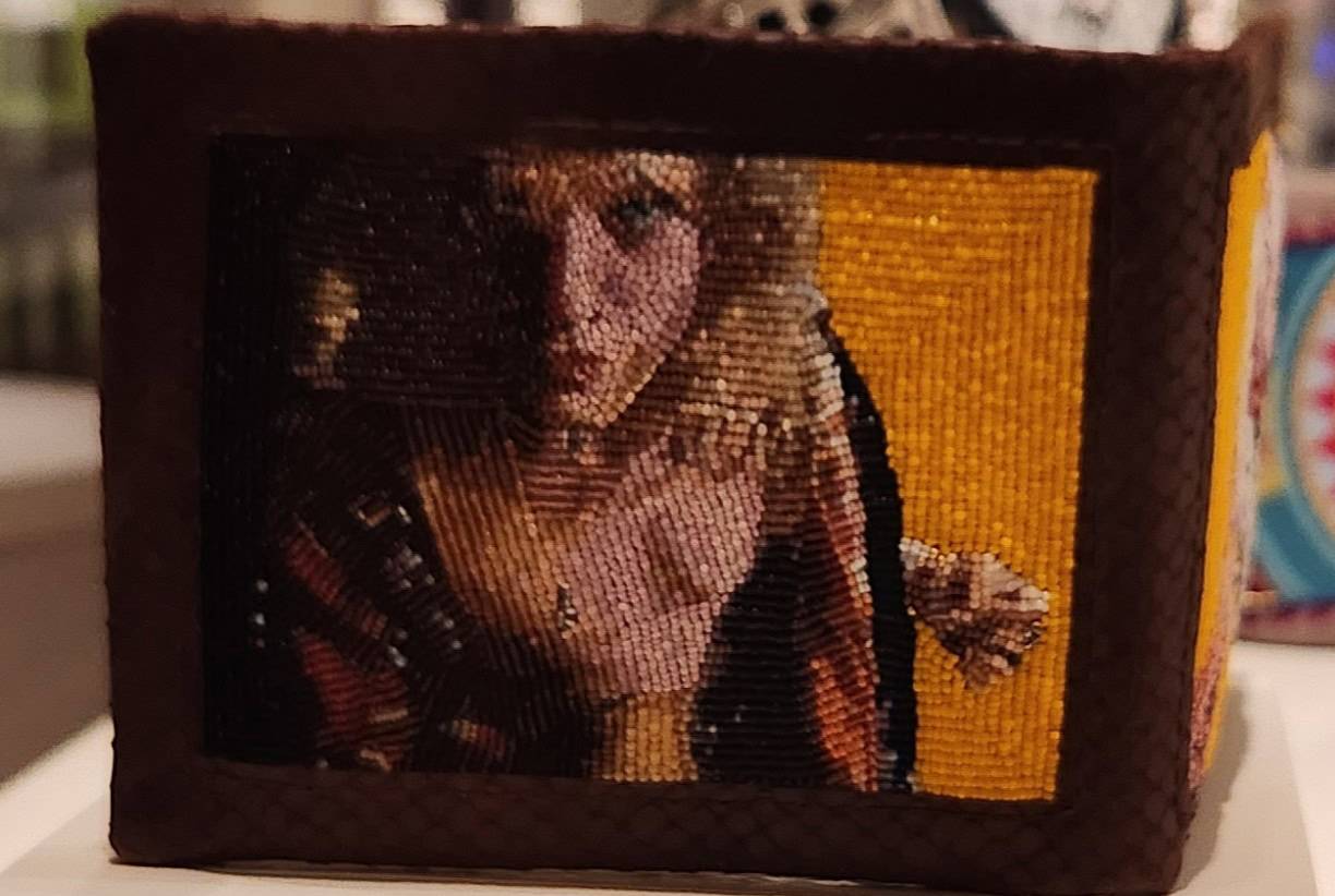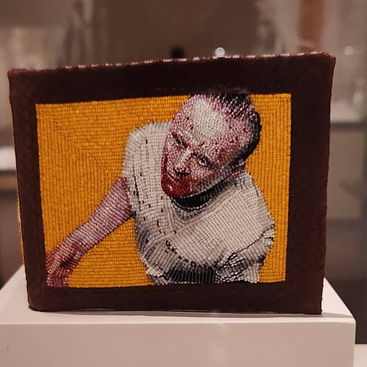 I was thrilled to see Jamie Okuma’s Fright Night (2019) in person after many years of admiring it from afar. Using microbeads Okuma recreates realistic versions of scenes from Francis Ford Coppola’s Dracula (2000) and Jonathan Demme’s Silence of the Lambs (1991) on a leather bag and wallet. While I’ve seen her caribou boots before at the textile museum in Denver (and they were great there), these objects are truly electric. First, let me confess that part of my love of Fright Night is sentimental. They remind me of a much younger me: a horror-obsessed high school goth, bespectacled and dog collared for many of her formative years. In person, however, it is obvious the works are also conceptually rigorous. Made to be attached to a belt, the beadwork on the front of the bag depicts the vampire Lucy screaming. In the context of Coppola’s film, Lucy has just returned to her mausoleum when she is confronted by her fiancée who has come to murder her. “Come to me, Arthur,” she moans seductively before Van Helsing abruptly shoves a crucifix in her face, which forces her screaming back into her coffin where they stake and behead her. In the next scene, Coppola juxtaposes Lucy’s dead head arcing through the air with Dracula’s furious realization that his newest progeny has died. Okuma’s bag appears to represent the scream and the beheading simultaneously. The image depicts an undead Lucy in all her glory while the spikes along the bag’s edge and the closely cropped image of Lucy’s head suggests her final end. The bag’s ability to conjure all these different moments and collapse them into one made me highly attuned to how beadwork plays with time and space in the rest of the exhibit.