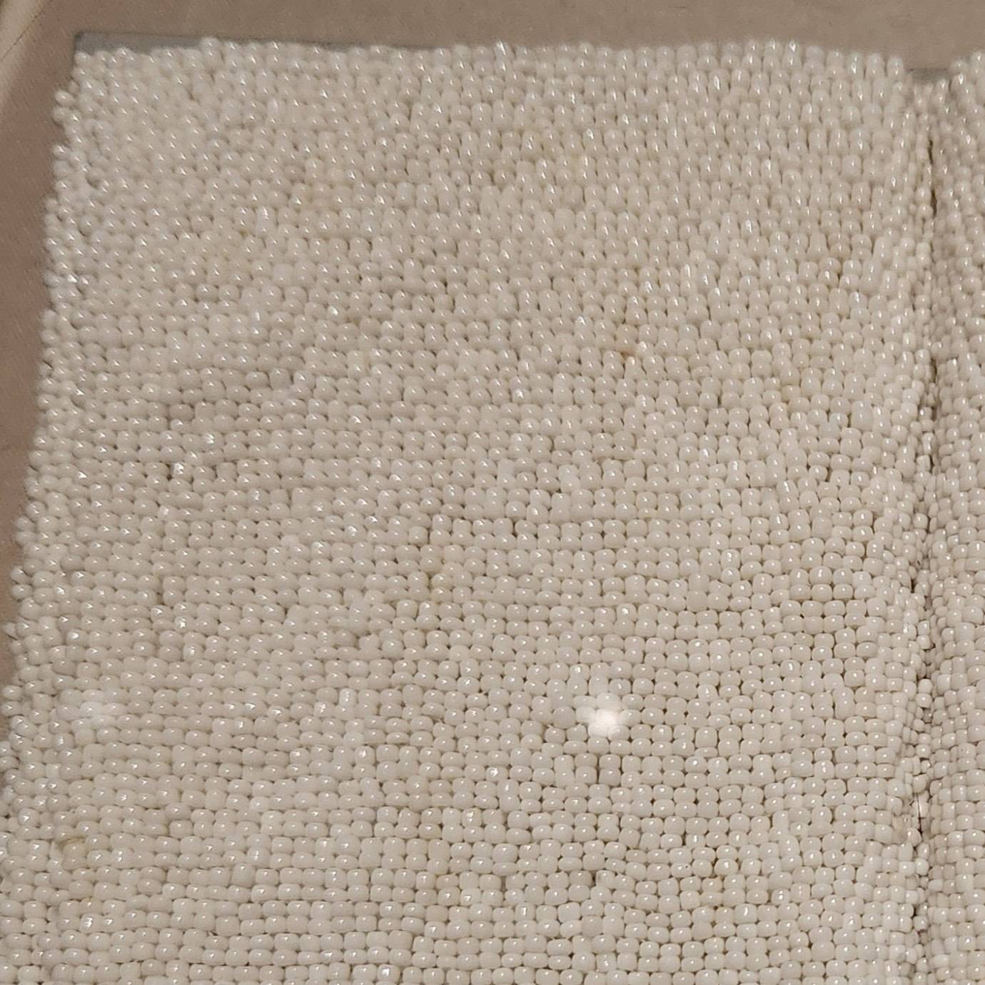 The wallet performs another kind of representational labour: Okuma takes images of two villains from the same film (Hannibal and Buffalo Bill) out of context and sets them both on an opaque yellow background. These stills come from scenes in Silence of the Lambs when these characters seem to me most “themselves”: when Hannibal pausing to listen to Glenn Gould’s “Goldberg Variations” before murdering his guards and when Buffalo Bill dancing to Q Lazzarus’ “Goodbye Horses” in front of a mirror while wearing a wig of human skin and women’s clothing. The music draws viewers into their fantasy space. Both are moments of repose and meditation where the film rests to explore the sensuous, aesthetic qualities of violence and murder. While newer versions of the franchise (the absolutely garbage Ryan Murphy television series) have exhausted this aspect of the original film/book, rendering its insights nearly meaningless, Okuma’s beadwork restores some of the original eeriness of the story by imaging them as still portraits that freeze the viewer in their reveries.