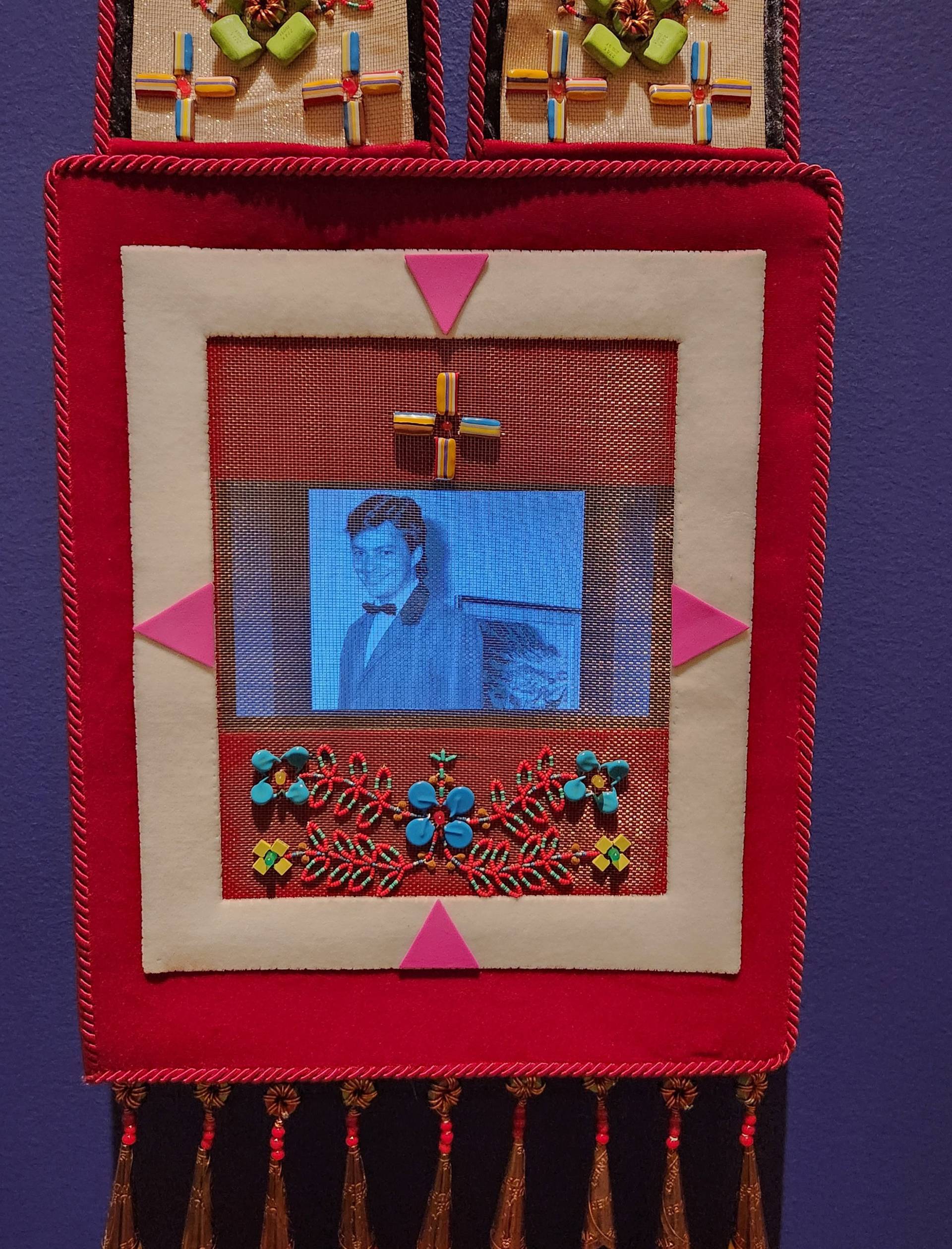 While moving through the show, I spent a lot of time thinking about beadwork and film. Both mediums shape time and space though the connections between them are slightly less obvious than film and comics, wherein the durational quality of the mediums seems self-evident. For instance, there is a working screen in the center of Barry Ace’s Bandolier for Alain Brosseau (2017) that contains a slide show of images and text explaining the hate crimes that led to Brosseau’s untimely death. Ace’s screen appears pixelated because there is a mesh sewn overtop of it, which makes the viewer see the similarities between the tiny pixels that comprise each image of film and the individual beads that comprise the decorative floral beadwork. The moments leading up to Brosseau’s death are catalogued and represented through images and title cards that explain where he died and the granular detail of the homophobic attacks against him. In Sculpting Time, Andrei Tarkovsky describes the “artistic image” on film to be a “detector of infinity” that affects us by drawing moments in time together in an experiential way: “Such a feeling is awoken by the completeness of the image: it affects us by this very fact of being impossible to dismember. In isolation, each component part will be dead—or perhaps, on the contrary, down to its tiniest elements it will display the same characteristics as the complete, finished work” (109). Like the frames of a film, each bead, in isolation, is somewhat inert but the act of linking them together produces an image. The work of tacking each little glass orb (one or three or five at a time) to leather, fabric, or other material is like the slow accretional quality of editing film. When done well, it is as if, as Tarkovsky says, “time itself, running through the shots, had met and linked together” (117). In the context of Ace’s work, the literal connection of beadwork and film allows him to do the memorial work necessary to render the absence of Brosseau immaterially present. Each frame and each bead seek to restore the broken image of the long dead in a processional mode that is monumentalized on the bag itself.