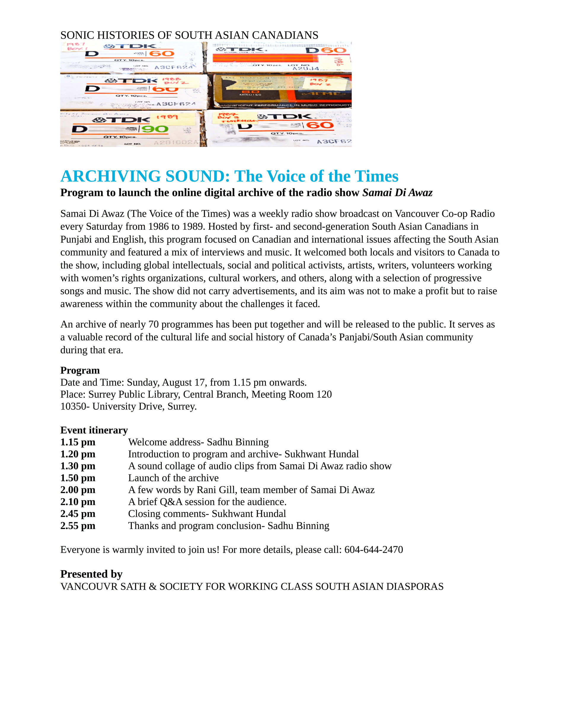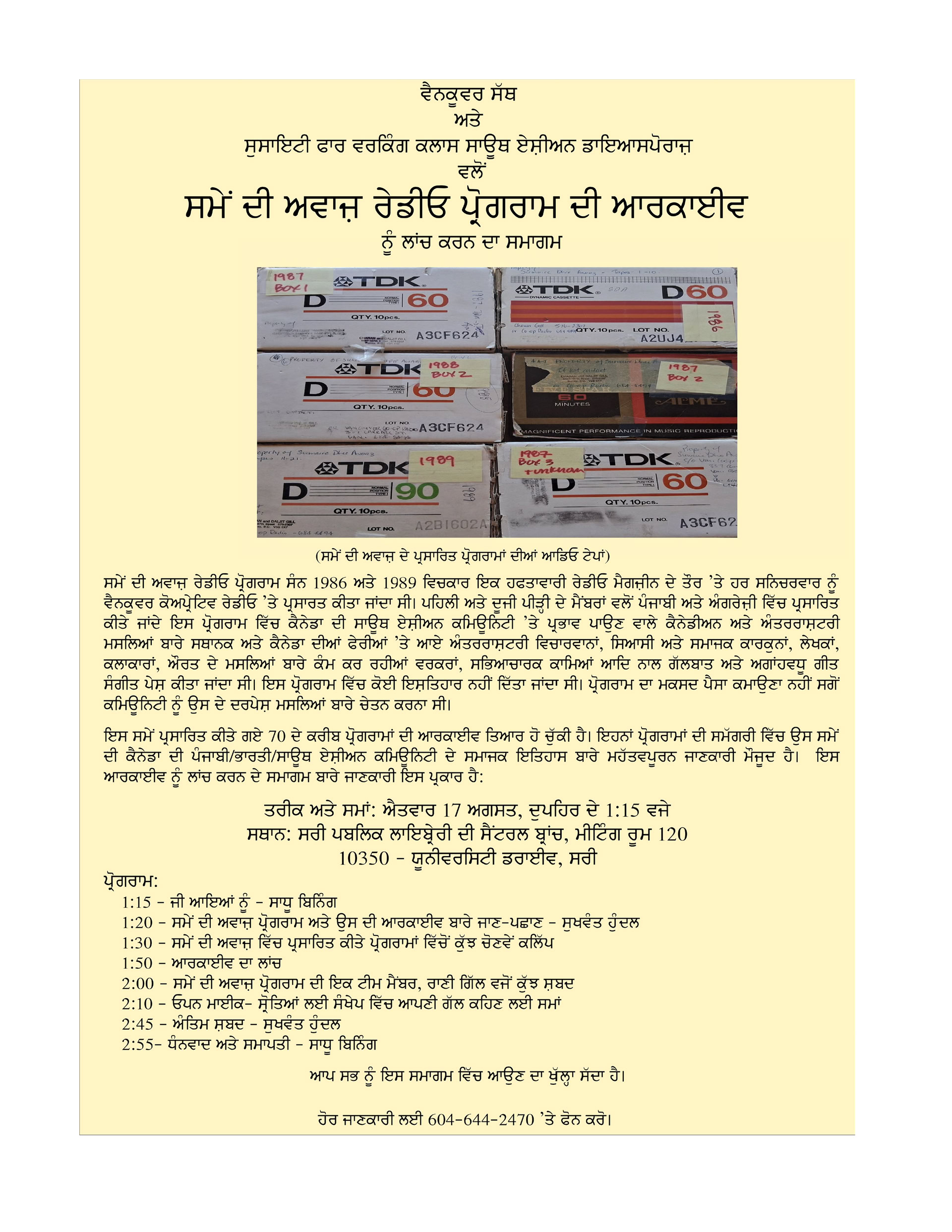 The launch event took place at the Surrey Public Library and was attended by over 60 people. The collection of more than 70 cassette tape recordings in the Punjabi and English languages were found by one of the program producers, Rani Gill, from the personal archives of her father, the late Charan Pal Gill. Charan Pal Gill had secured the original broadcast slot on Co-op Radio on behalf of the Progressive Intercultural Community Services Society (PICS). Rani Gill provided the recordings to Sukhwant Hundal, another member of the original producer group and Hundal digitized them into a podcast format. At the launch, presentations were made by Hundal, Gill, Sadhu Binning and Harji Sangra, amongst others.